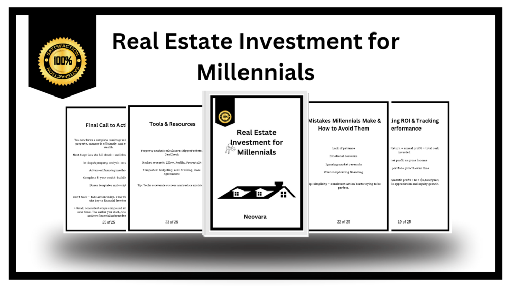 Real Estate Investment for Millennials is your complete roadmap to start investing in real estate with little capital. Learn proven strategies millennials are using to generate passive income, scale portfolios, and achieve financial freedom — step-by-step and easy to follow. Comes with a full audiobook and lifetime updates, so you can learn anytime and take action immediately.